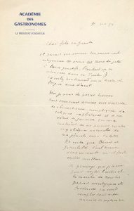 de l'Académie des Gastronomes. Avec beaucoup d'humour, le Prince des Gastronomes évoque ses problèmes de santé qui l'ont " contraint à ne pouvoir assister aux obsèques de [sa] géniale amie Colette ". - Pomiane (Édouard de). L.A.S., sans nom de destinataire. 1er mars [1951]. 1 page in-4, à en-tête de l'Institut Pasteur. Il décline l'invitation à participer à la réunion de fondation de la Compagnie des écrivains gastronomes que R. Courtine a fondé en avril 1951, " Je m'associe à votre association [sic]. J'écris depuis 50 ans sur la cuisine ! Malheureusement je ne suis pas à Paris le mardi 6 mars ". - Cazes (Roger). Lettre dactylographiée signée. Paris, 24 novembre 1983. " Vous rendez hommage à Lipp et à mon père, rien ne pouvait m'être plus agréable " [] et plus loin, à propos de François Mitterand : " Le président est venu dîner ici le 8 novembre 1981, c'était en plein état de grâce ". - Ramain (Dr. Paul). 2 L.A.S., 1953 et 1954, 1 page ½ in-8 et 1 page ½ in-12, à propos d'articles de Courtine dans la revue " Cuisine et vins de France " dont 2 numéros sont joints.