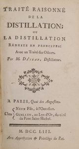 * DÉJEAN (pseud. d'Antoine Hornot). Traité raisonné de la distillation, ou la Distillation réduite en principes, avec un Traité des odeurs, par M. Déjean. À Paris, chez Nyon fils et Guillyn, 1753. In-12, X, [1] f., 484 p., [4] f. comprenant...