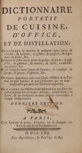 * DICTIONNAIRE PORTATIF de cuisine, d'office et de distillation. À Paris, chez Lottin, 1770. Deux parties en 1 fort vol. in-12, VIII-384-382 p., [1] f., demi-basane fauve racinée récente, dos à nerfs et orné, pièce de titre basane grenat...