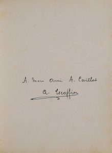 ne possèdent que 36 pages), illustrée d'un portrait de l'auteur en frontispice, 1 planche représentant des fleurs de magnolia en cire exécutées par l'auteur pour l'exposition culinaire de Londres en 1902, et 40 gravures explicatives dans le texte.Tirage limité à 250 ex. numérotés : un des 200 sur Hollande Van Gelder. Signature de l'auteur à la justification et envoi autographe signé du même à son ami Apollon Caillat (1857-1942) qui eut une grande renommée comme chef de cuisine à l'Hôtel du Louvre à Marseille.