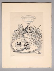 * Kiyoshi HASEGAWA (1891-1980). [Composition gastronomique avec raisins, coupe, petits fours et cigare]. Eau-forte originale, signée au crayon en bas à droite et numérotée 61/110. 23 × 17,5 cm au coup de planche. Cette estampe forme la...