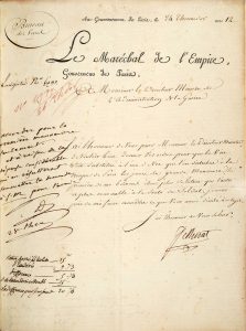 doré au plat sup. (dos et coins frottés, qq. rousseurs). Murat demande que le vin soit substitué à l'alcool que l'on distribue à la troupe de Paris les jours de manoeuvres, " la première de ces boissons étant plus salutaire que l'auteur et plus convenable à la santé du soldat ". Note autographe de Dejean en marge : " Accorder pour la première manoeuvre seulement, et en raison de la dépense considérable qui en résulteroit, soumettre la demande à S[a] M[ajesté] pour l'avenir ". (Chwartz, M 182).