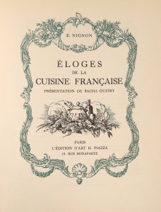 * NIGNON (Édouard). Éloges de la cuisine française. Présentation de Sacha Guitry. Paris, Piazza, 1933. Petit in-4, 444 p., broché. Édition originale illustrée d'ornements de Pierre Courtois. " Ce livre est un des meilleurs recueils de recettes...