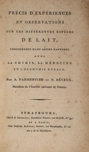 * PARMENTIER (Antoine Augustin), DEYEUX (Nicolas). Précis d'expériences et observations sur les différentes espèces de lait, considérées dans leurs rapports avec la chimie, la médecine et l'économie rurale. Strasbourg, Levrault ; Paris,...