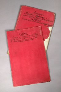 Mr. Garnier à Pom[m]ard. Comencé le 9 brumaire an 10 In-folio, [114] pages dont 108 écrites. Deux cahiers brochés sous couvertures roses de l'époque portant le titre manuscrit (une couverture incomplète). Registre tenu par Bollanger, qui fut également le régisseur de la marquise d'Anglade sur ses terres de Pommard. Il reflète précisément l'activité du domaine, offrant une image inédite des dépenses de fonctionnement et des ventes de vins réalisées. Le cahier de caisse couvre les années 9 et 10 de la République. Plus important, le Journal des recettes et dépenses court de 1791 à 1808.