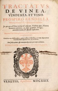 * RENDELLA (Prospero). Tractatus de vinea, vindemia et vino, Prospero Rendella, authore, in quo quae ad vineae tutelam et culturam, vindemiae opus, vinitoris documenta pertinent, ac plures quaestiones explicantur Venetiis, apud Juntas, 1629....
