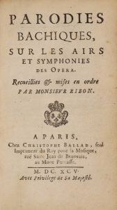 * RIBON. Parodies bachiques, sur les airs et symphonies des opéra. Recueillies & mises en ordre par Monsieur Ribon. À Paris, chez Christophe Balla[r]d, 1695. In-12, [2] f. [Titre, Avertissement], 247 p., ornements et musiques gravés sur bois dans...