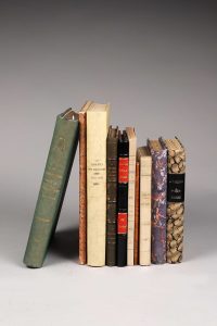 (appendices), [2] f., demi-basane verte à coins moderne ornée. Théorie sur la formation de la grêle et sur les effets du tir contre les nuages. Les essais ont été effectués en Beaujolais. Illustré de 12 planches et de 2 cartes en couleurs. (Chwartz, C-76). - HOUDAILLE (F.). Les orages à grêle et les tirs des canons. Avec 63 gravures dans le texte. Paris, Félix Alcan, 1901. In-12, [2] f., 244 p., cartonnage marbré moderne. Édition originale de cet ouvrage considéré comme l'un des premiers manuels français sur le sujet, avec celui du comte de Chabannes La Palice : techniques, historique depuis 1890, protection des vignobles, etc. L'auteur était professeur de physique et météorologie à l'École d'Agriculture de Montpellier. (Chwartz, H-19). - MACHARD (Henri). Traité pratique sur les Vins. Besançon, Dodivers, 1860. In-12, [2] f., XII-344 p., broché (couvrure manquante au dos). Troisième édition de ce traité de vinification consacré surtout au travail des vins du Jura. L'auteur examine en particulier les vins blancs de garde et vins jaunes avec une notice ampélographique et un chapitre sur les vins de paille. (Chwartz, M-1). - CHAVASTELON (R.). Conseils pratiques aux viticulteurs d'Auvergne. Clermont-Ferrand, Typog. Mont-Louis, 1905. In-12, pp. 4-50, demi-basane havane racinée moderne. L'auteur était directeur du Laboratoire d'oenologie de Clermont-Ferrand.(Chwartz, C-157). - CAZEAUX (Alfred). Descriptions des principales variétés de vignes américaines, françaises ou de l'Ancien Monde, suivies d'instructions pratiques sur la reconstitution des vignobles ; plantations, cultures, greffages Tours, E. Arrault, 1888. In-12, 379 p., [1] f., cartonnage marbré moderne (rousseurs). Première édition, " en vente chez l'auteur ", propriétaire-viticulteur à Casseuil en Gironde. (Chwartz, C-73). - CLARAC (Charles). Greffage de la vigne en écusson. Manuel pratique. Avec 30 figures dans le texte. Montpellier, Coulet, 1900. In-12, [2] f., 73 p., [1] f., demi-basane noire moderne, pièce de titre rouge. " Avant l'invasion phylloxérique, le greffage était uniquement pratiqué sur de vieilles souches locales dont on voulait, sans les arracher, changer la nature du cépage. Aujourd'hui le greffage a pour but de faire végéter les vignes européennes, qui ne résistent pas au phylloxéra, sur des vignes américaines qui, elles, sont toutes résistantes " (Simon, B.V., 66 ; Chwartz, C-174). - Congrès national des médecins amis des vins de France. 1er congrès, Bordeaux, 1933 et 2ème congrès, Béziers, 1934. 2 vol. grand. in-8, cartonnages marbrés modernes (accroc à une coiffe). - GUICHERD (Jean). Monographie des cépages de l'Aube. Étude d'ampélographie. Avec 45 dessins de l'auteur intercalés dans le texte. Troyes, Imp. Nouai, 1905. In-8, VII-237 p., broché. Ampélographie rétrospective des vignobles de l'Aube ; liste des cépages de l'Aube en 1903 ; orientation à donner à l'encépagement des nouvelles vignes, etc. (Chwartz, G-96). - GABRIEL (Pierre). La viticulture dans le département de l'Aube. Monographie d'économie régionale Thèse pour le doctorat. Paris, Rousseau, 1913. In-8, demi-basane verte moderne (dos passé). (Chwartz, G-1). Soit 10 volumes.