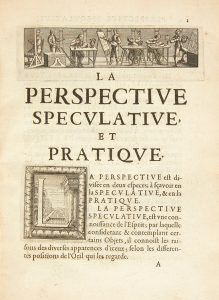 La Perspective speculative et pratique. Ou sont demonstrez les fondemens de cet art, & de tout ce qui en a esté enseigné jusqu'à présent. Ensemble la manière universelle de la pratiquer, non seulement sans geometral, & sans tiers poinct... De l'invention du sieur Aleaume... Mis au jour par Estienne Migon. Paris, Melchior Tavernier & François Langlois, 1643. In-4 (234 x 167 mm) de 4 ff.n.ch.