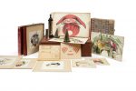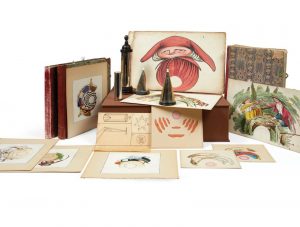 Important coffret de grande taille (500 x 400 x 145 mm) réunissant 80 planches d'anamorphoses (aquarelles, dessins ou gravures) de formats divers (entre 25 x 170 mm et 300 x 455 mm) sur cartons, accompagné de 4 miroirs de tailles et formes différentes (un cône, deux cylindres, et une pyramide) dont 3 sur socles en bois.