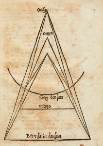 Perspectiva. In qua, quae ab aliis fuse traduntur, succinte, nervose & ita pertractantur, ut omnium intellectui facile pateant.- Specula mathematica: In qua de Specierum multiplicatione, earundemque in inferioribus virture agitur. Francfort, Wolfgang Richter, 1614. 2 parties en 1 volume in-4 (200 x 154 mm) de 4 ff.n.ch., 205 pp., 4 planches gravées sur bois hors texte et nombreux schémas dans le texte pour la Perspectiva: 4 ff.n.ch., 83 pp., quelques schémas gravés sur bois dans le texte pour la Specula; vélin ivoire, pièce de titre moderne (vélin de remploi).