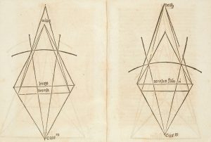 Specula mathematica: In qua de Specierum multiplicatione, earundemque in inferioribus virture agitur.- Perspectiva. In qua, quae ab aliis fuse traduntur, succinte, nervose & ita pertractantur, ut omnium intellectui facile pateant. Francfort, Wolfgang Richter, 1614. 2 parties en 1 volume in-4 (196 x 147 mm) 4 ff.n.ch., 83 pp., quelques schémas gravés sur bois dans le texte pour Specula; 4 ff.n.ch., 205 pp., 4 planches gravées sur bois hors texte et nombreux schémas dans le texte pour Perspectiva:; vélin ivoire, traces de lacets (fragment d'un missel du XVe siècle).