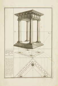 La Perspective practique de l'architecture. Paris, chez l'auteur, Pierre Miquelin, 1706. In-folio (443 x 295 mm) de 4 ff. dont le titre et un frontispice architectural, 52 planches non signées et 2 ff. gravés de leçons et principes; demi-basane brune à coins, dos à nerfs orné, pièce de titre bordeaux (reliure de l' époque).