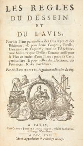 Les Règles du dessein et du lavis, pour les plans particuliers des ouvrages & des bâtimens, & pour leurs coupes, profils, élévations & façades. Paris, Claude Jombert, 1722. In-8 (194 x 119 mm) de 10 ff.n.ch. (dont les 2 feuillets d'errata pour texte et planches), 130 pp., 3 ff.n.ch., 14 planches gravées dépliantes hors texte; veau moucheté, dos à nerfs orné, tranches mouchetées (reliure de l' époque).