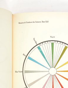 Mémoire sur la vision des couleurs matérielles en mouvement de rotation et des vitesses numériques de cercles. (Institut de France. Mémoires de l'académie des sciences, extrait du tome XLII). Paris, Firmin-Didot, 1882. In-4 (279 x 218 mm) de 378 pp., 19 planches dont 16 en couleurs; demi-chagrin rouge, dos à nerfs, couverture conservée (ateliers Laurenchet).