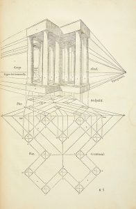 La plus importante des innovations de Cousin par rapport à la méthode de Viator consiste à distinguer deux plans de nature différente pour tracer une figure en perspective. Ces deux plans sont dessinés l'un audessus de l'autre: le plan géométral, c'est-à-dire orthogonal, où les figures ne subissent pas de déformations optiques; et le plan perspectif, défini par le point de fuite et les deux tiers points. On obtient une figure en perspective en reportant sur le plan perspectif les coordonnées de la figure définie dans le plan orthogonal.