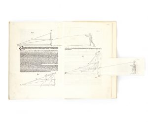 Underweysung der Messung mit dem Zirckel und Richtscheyt in Linien, Ebnen unnd gantzen Corporen. Nuremberg, Hieronymus Andreas Formschneider, 1525. In-folio (308 x 210 mm) de 90 ff.n.ch. (dont le dernier blanc). Collation: A-N 6 O-Q 4, très nombreuses illustrations gravées sur bois dans le texte (dont deux dépliantes pour les feuillets P4 et Q1 et deux corrections montées aux feuillets C5 et K1); vélin moderne.