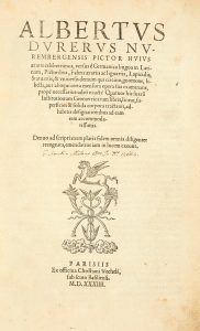 Seconde édition de cette importante traduction latine par Joachim Camerarius. Les bois illustrant les quatre livres ont été numérotés pour cette édition et représentent des diagrammes, monuments, un alphabet et des formes géométriques, ainsi que la célèbre planche représentant Dürer dessinant un luth. Exemplaire bien complet des parties mobiles pages 179 et 181.