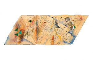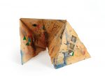 Beautiful book object created as a large pyramid to unfold, with all sides covered with the characteristic cryptic writing and decorations by Timothy Ely. Produced in a undefi ned number of copies the colourful hexagonal title is mounted on the inside of the box, and signed in pencil by both artists.