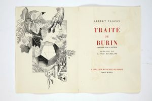 Traité du burin. Paris, librairie Auguste Blaizot, 1952. Grand in-8 225 x 170 mm) de 104 pp., 5 ff.n.ch., 23 burins dont 9 hors texte d'Albert Flocon ainsi que 7 lettrines en deux couleurs; en feuilles, couverture originale illustrée, chemise de cartonnage imitant du buffle.