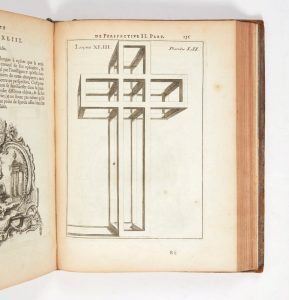 Traité de perspective à l'usage des artistes. Où l'on démontre géométriquement toutes les pratiques de cette science, & où l'on enseigne, selon la méthode M. le Clerc, à mettre toutes sortes d'objets en perspective. Paris, Charles-Antoine Jombert, 1750. In-4 (255 x 193 mm) de VI pp., 1 f.n.ch., 240 pp., 1 f.n.ch. (errata); veau tacheté, dos à nerfs orné, tranches rouges (reliure de l' époque).