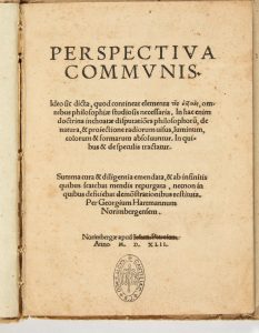 Perspectiva communis... Summa cura & diligentia emendata, & ab infinitis quibus scatebat mendi expurgata per Georgium Hartmannum. Nuremberg, Johan Petreius, 1542. In-4 (196 x 146 mm) de 55 ff.n.ch.; cartonnage d'attente (reliure italienne du XVIIIe siècle).