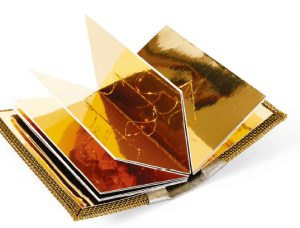 Livre objet de très petit format, signé aux initiales “WAW” (?) et daté 1998. Il est composé de feuilles dorées servant de miroirs, dans lesquels un jeu géométrique avec les fi ls dorés s'opère lorsque ceux-ci se déploient en ouvrant les pages. Bel objet.