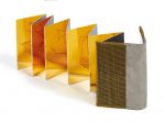 Intriguing small-format pop-up book, constructed with mirror like gold paper to which are mounted gold threads which form geometrical objects when opening. Signed with the initials “WAW” (?) and dated 1998.