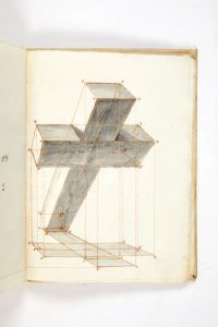 Anonymous illustrated manuscript with 76 skillfully executed double page ink and wash perspective diagrams accompanied by Latin text, most likely comprising the perspective section of an Italian optics course. An overview of the fundamentals of perspective theory, the work presents Albertian techniques as adapted by Serlio, Piero della Francesca, and others. Structured in two parts, with the diagrams bound after the text portion, the manuscript deals with ichonographia (plans and surveying) and the second with elevations, or three-dimensional diagrams. Many of the diagrams are architectural in nature, illustrating arches, stairs, windows and doors.