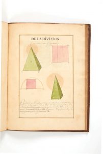 Fine calligraphic teaching manual, dated 23 May 1727, richly illustrated with 59 coloured drawings of solids and polyhedrons drawn in perspective.