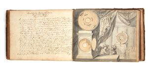 Horologiographie. [Manuscrit sur papier]. Lübeck [?] 1708. In-4 oblong (158 x 205 mm) de 170 ff.n.ch. richement illustré de près de 170 dessins originaux au lavis dont 3 avec volvelles; veau brun, triple filet et fleurons d'angles a froid, dos à nerfs (reliure germanique de l' époque).