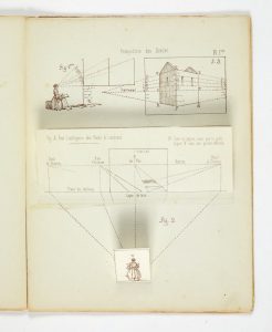 Éléments de perspective pratique à l'usage des jeunes élèves, comprenant la perspective des droites et des courbes, celle des ombres et des lignes de refléxion dans l'eau. Orléans, impr. Goueffon & chez l'auteur, 1858. In-folio (329 x 252 mm) de titre-couverture, 30 pp., 14 planches lithographiées et tirées en sépia avec 52 figures (dont 2 parties mobiles sur la planche I); en feuilles, couverture-titre imprimée de l'éditeur.