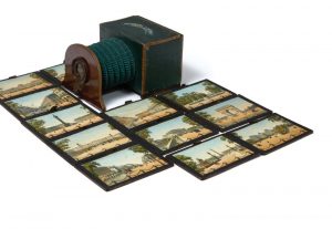 Jouet optique français inventé sous le second Empire par l'opticien parisien Lemaire, qui permettait de visionner des tableaux grâce aux variations de la lumière. Les planches encadrées, lithographiées et coloriées à l'époque sont tirées sur un papier fin translucide. En dépliant le soufflet, en enfermant la vue choisie dans le boîtier et en plaçant l'oeil face à l'optique, on peut observer la scène à deux moments différents: grâce au mécanisme de l'appareil et en manipulant les volets avec soin, on passe d'une vision diurne à une vision nocturne illuminée. Les douze scènes sont consacrées aux monuments parisiens: