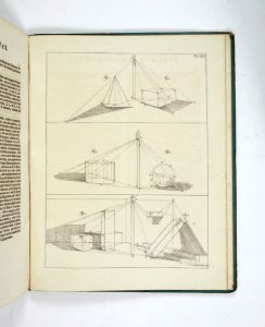 Cette belle édition illustrée suit l'exemple classique d'un manuel d'instruction en commençant par des formes géométriques, suivie par les cinq ordres, des détails d'architecture, des voûtes, et des détails sur la perspective, les ombres et la lumière.