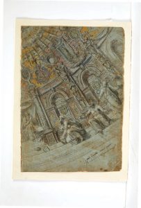 Dessin pour la décoration d'une coupole. [vers la fin du XVIe siècle]. Un feuille de papier bleuté in-folio (402 x 279 mm) dessin au crayon, encre brune, colorié et rehaussé en blanc.