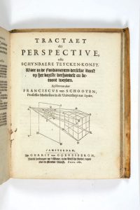 Mathematische Oeffeningen, begrepen in vijf boecken... Waer by gevougt is een tractaet, handelende van Reeckening in Speelen van Geluck, door Christian Hugenius. Desen drick vermeerdertmet en korte verhandeling van de fondamenten der Perspective. Amsterdam, Gerrit van Goedesbergh, 1659-1660. In-4 (197 x 152 mm) de 544 pp.; vélin ivoire à rabais, dos lisse (reliure de l' époque).