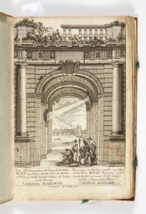 Two very beautiful theatre stage design books illustrating the wondrously and ingenious mobile theatre settings invented and produced by the Venetian engineer Giacomo Torricelli. His appartus included counter-weight machinery allowing the use of large objects (including entire ships) to be displayed and removed easily from the scenes. Torelli was among the first to apply engines and mechanical devices for the rapid changing of scenes. His ingenious system allowed just one single mechanic to control the whole setting. After the destruction of the Petit-Bourbon his machines got destroyed but the ingenious plans are visible in the Encyclopaedie by Diderot & d'Alembert (section Machines du Théâtre).