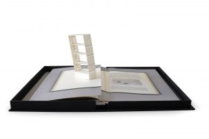 In-4 (317 x 204 mm) de 7 ff.n.ch. contenant 6 créations en 3D de Sjoerd Hofstra; toile noire, plat supérieur orné à froid montrant une bibliothèque, dos lisse avec titre au palladium, étui de l'éditeur.