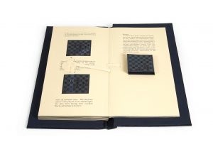 In-4 (374 x 187 mm) de 17 ff.n.ch. cartonnés avec 11 fenêtres de rhodoïd imprimées d'un échiquier dont 9 avec parties mobiles et un pop-up; soie brute bleu marine avec titre à froid au plat, dos lisse de basane bleue titré à froid, étui de l'éditeur assorti.