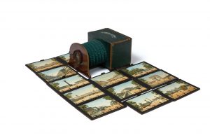 Jouet optique français inventé sous le second Empire par l'opticien parisien Lemaire, qui permettait de visionner des tableaux grâce aux variations de la lumière. Les planches encadrées, lithographiées et coloriées à l'époque sont tirées sur un papier fin translucide. En dépliant le soufflet, en enfermant la vue choisie dans le boîtier et en plaçant l'oeil face à l'optique, on peut observer la scène à deux moments différents: grâce au mécanisme de l'appareil et en manipulant les volets avec soin, on passe d'une vision diurne à une vision nocturne illuminée. Les douze scènes sont consacrées aux monuments parisiens: