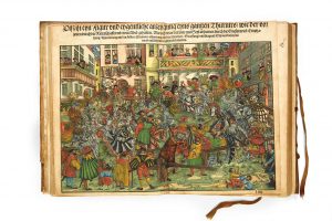 Exemplaire complet du double feuillet de ce grand classique des livres allemands illustrés du XVIe siècle. Les exemplaires coloriés sont rares.