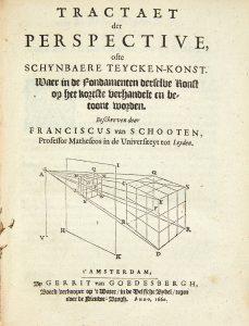 Mathematische Oeffeningen, begrepen in vijf boecken... Waer by gevougt is een tractaet, handelende van Reeckening in Speelen van Geluck, door Christian Hugenius. Desen drick vermeerdertmet en korte verhandeling van de fondamenten der Perspective. Amsterdam, Gerrit van Goedesbergh, 1659-1660. In-4 (197 x 152 mm) de 544 pp.; vélin ivoire à rabais, dos lisse (reliure de l' époque).