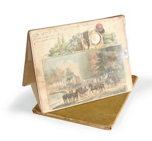 Téléorama hollandais représentant la perspective d'une scène de course de chevaux très animée, située dans un grand parc. Le feuillet de couverture montre les coureurs en avant-scène, avec quelques militaires montés à cheval à gauche, en arrière-fond s'élève une belle demeure à côté d'un étang. Bel objet en bon état, malgré de petites taches sur le premier feuillet.