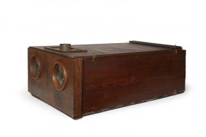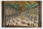 THEATRE D'OPTIQUE. Boitier en bois, accompagné de 58 vues d'optique gravées du XVIIIe siècle. Augsbourg et d'autres lieux, vers 1750 et après. Boitier en bois (850 x 570 x 300 mm) composé de 2 lunettes pour laisser entrer la lumière, en face installation d'un système pour la fixation des vues d'optique, sol peint en damier (boîtier du XVIIIe siècle, restauré).
