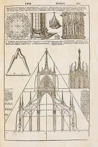 Les gravures donnant le plan et l'élévation de la cathédrale de Milan (feuillets 14 et 15) passent pour être les toutes premières représentations d'un édifice gothique dans un livre imprimé. La belle marque de Gottardo da Ponte gravée sur le titre et de nombreuses lettrines complètent l'illustration de ce chefd'oeuvre de la typographie lombarde. Plusieurs historiens et bibliographes soulignent les similitudes entre les figures de Cesariano et les dessins de Léonard de Vinci. Le rédacteur de la notice du catalogue de la British Architectural Library commente: "This is certainly true, although the corollary that Cesariano was a pupil of Leonardo is not supported by the available evidence, which suggests rather that he was trained by Donato Bramante. Some have suggested that Leonardo was among the 'molti excellenti pictori' who are said to have contributed to the work, although this influence was mostly probably felt through other artists and not directly". La rédaction et l'impression du Vitruve de 1521 ont été une véritable aventure, dont on trouvera les détails dans Pollard, Vagnetti (2000 anni di Vitruvio), ou Gatti et Monduccio (Nuovi documenti su Cesare Cesariano e la sua edizione del De architectura, 1994). Cesariano, qui envisageait une édition de Vitruve dès les premières années du siècle, quitta Milan précipitamment en octobre 1515, lors de l'invasion française; il emportait avec lui les notes pour le De architectura. L'impression du texte, établi en collaboration avec Massimo Bono Mauro et Benedetto Giovio, débuta en avril 1521 avec le soutien financier d'Agostino Gallo et Aloisio Pirovano. Au mois de mai de la même année, une dispute s'éleva entre Cesariano et ses collaborateurs. L'architecte essaya de quitter Como en emportant ses notes et une partie des bois gravés, mais il fut appréhendé et contraint à restituer le matériel subtilisé.
