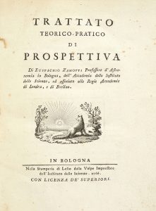 Édition originale de cet important traité de perspective. Zanotti (1709-1782) était professeur d'astronomie à Bologne et publia plusieurs ouvrages d'intérêt scientifique. Sa Prospettiva, illustrée de 11 planches gravées en complément du texte très complet, eut un grand succès éditorial et elle fut publiée à nouveau en 1825.