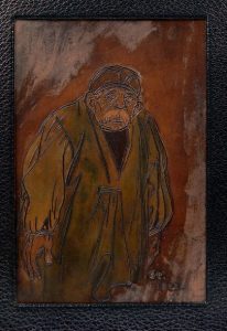 Un cuir incisé et coloré de Steinlen, représentant Crainquebille debout (205 x 139 mm), monogrammé à la pointe et daté «1922», est enchâssé dans le premier plat de la reliure réalisée par Marius Michel (1846-1925).