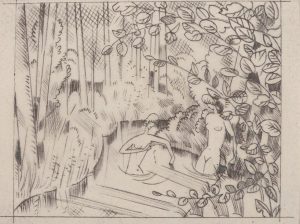 L'un des 5 premiers exemplaires numérotés I à V (n° I), contenant: - une aquarelle originale, signée. Dimensions: 151 x 101 mm. Elle reprend le thème de l'illustration de la p. 129; - une suite des burins, signés, en premier état, sur japon ancien, à grandes marges, soit 27 planches. Elle est conservée dans sa chemise d'origine. Quelques planches présentent des traces d'empoussiérage; - une suite des burins de l'état définitif sur vélin d'Arches, soit 27 planches.