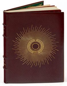Cinq poèmes. Paris, Pelletan, 1902, 2 volumes in-4°, maroquin prune, couronne de laurier irradiante sur les deux plats, dos à nerfs, doublures de maroquin vert (serti d'une guirlande florale dorée pour le volume de texte; vierge pour celui des dessins), gardes de tabis prune, couverture et dos, tranches dorées sur témoins, chemise et étuis gainés de maroquin prune (E. & A. Maylander).