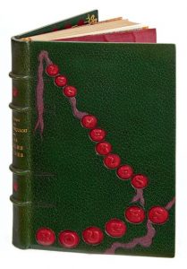 Les Perles rouges. 93 sonnets historiques. Paris, Bibliothèque-Charpentier, Eugène Fasquelle, éditeur, 1899, in-12, maroquin vert bouteille, sur le premier plat collier de perles mosaïquées de maroquin rouge, sur chacune d'elles une lettre du titre frappée à froid, réunies par un ruban de maroquin parme, dos à nerfs orné de même, bordure de maroquin vert bouteille mosaïquée de perles de maroquin rouge sang montées sur un large filet doré noué aux angles, doublure et gardes de soie moirée rouge sang, couverture, tête dorée, étui gainé de même maroquin (Ch. Meunier).